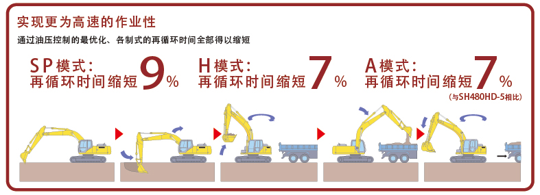 挖掘翻斗累積的作業(yè)時間、與現(xiàn)行SH480HD-5相比有9%的速度提升。同時在有必要進行微操作時、操作性的控制更為優(yōu)越、力量與操作性并存。